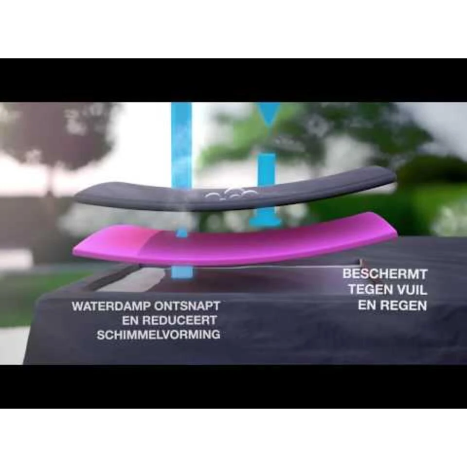 Met deze Aerocover hoes beschermt jij je tuinset optimaal. De hoes beschermt tegen alle weersinvloeden en voorkomt bovendien schimmelvorming. De afmeting van de tuinsethoes is 280 centimeter breed, 190 centimeter diep, en 85 centimeter hoog. De Aerocover tuinsethoes is gemaakt van ripstop polyester. Dit is een polyester stof met een speciaal raster van vierkantjes. Deze vierkantjes zorgen ervoor dat de hoes soepel blijft. Ook zorgen ze ervoor dat als er een gaatje in de hoes komt deze niet verder scheurt. Het voordeel van deze hoes is dat de stof ademend is. Dit zorgt ervoor dat het vocht dat onder de hoes komt kan ontsnappen. Zo blijven je kussens droog onder de hoes en zal er geen schimmelvorming ontstaan. Door het aantrekkoord aan de onderzijde kun je de beschermhoes mooi strak zetten.