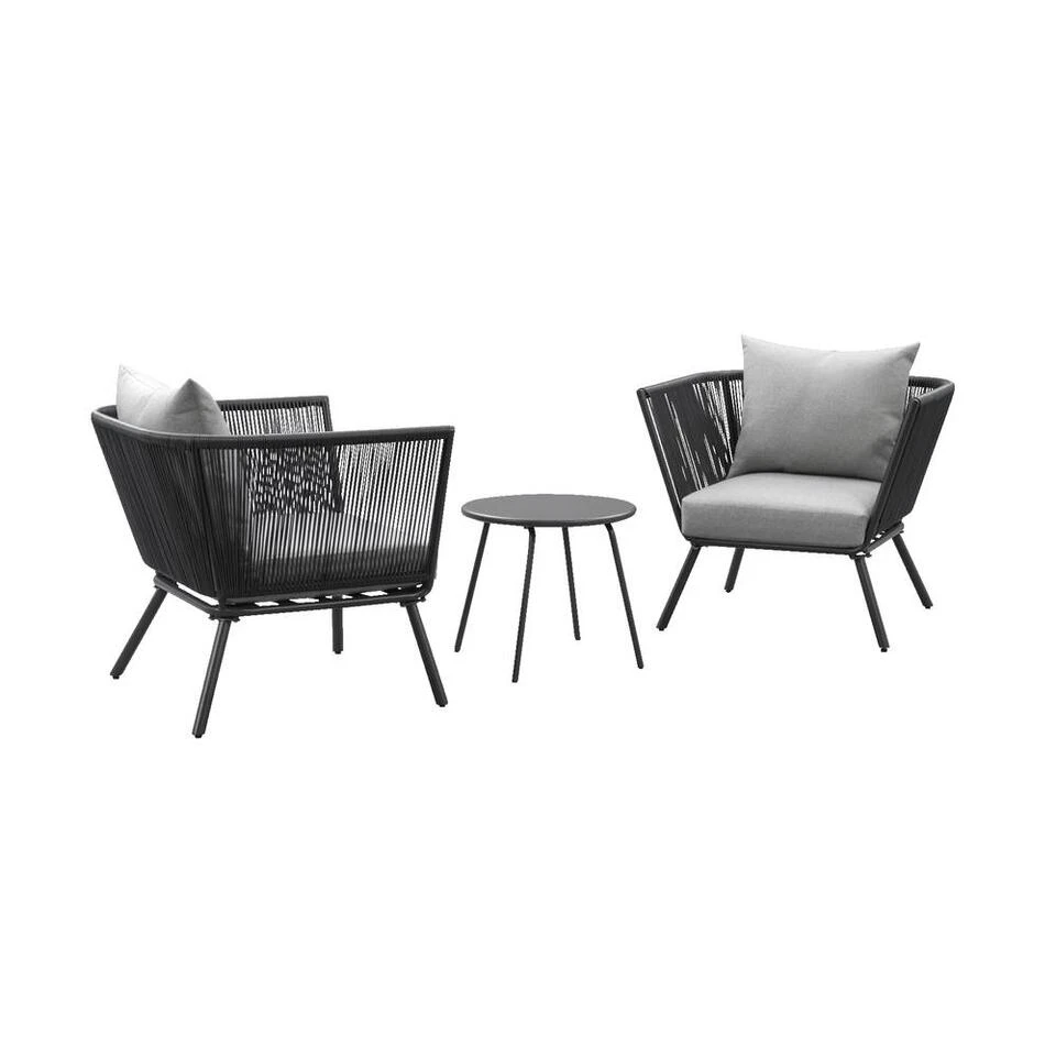 Deze loungeset bestaat uit een bijzettafel en 2 loungefauteuils. Deze tuinmeubelen zijn gemmaakt van antracietkleurig metaal. Dit zorgt ervoor dat de Almeria meubelen een moderne en stoere uitstraling hebben. Deze balkonset wordt geleverd inclusief heerlijke comfortabele grijze loungekussens. De Almeria set is gecombineerd met 1 ronde Vilanova bijzettafel. Deze tafel is antraciet van kleur en gemaakt van metaal. Door het gebruik van weerbestendige en onderhoudsarme materialen is deze loungeset perfect voor buiten gebruik. En natuurlijk de perfecte keus als je wilt genieten van mooie, stijlvolle meubelen, maar geen tijd kwijt wilt zijn aan het onderhoud.