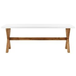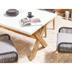 Moderne tuintafel van vezelcement en acaciahout. Geef je tuin meer sfeer met deze eettafel, die het dineren met familie en vrienden zoveel leuker maakt. Het tafelblad is perfect voor buitengebruik, omdat het gemakkelijk te reinigen en te onderhouden is en bestand is tegen verschillende weersomstandigheden. De poten zorgen voor de nodige stevigheid en vormen een opvallend contrast met het blad. Deze tafel past zeker in een modern of minimalistisch ingerichte tuin.