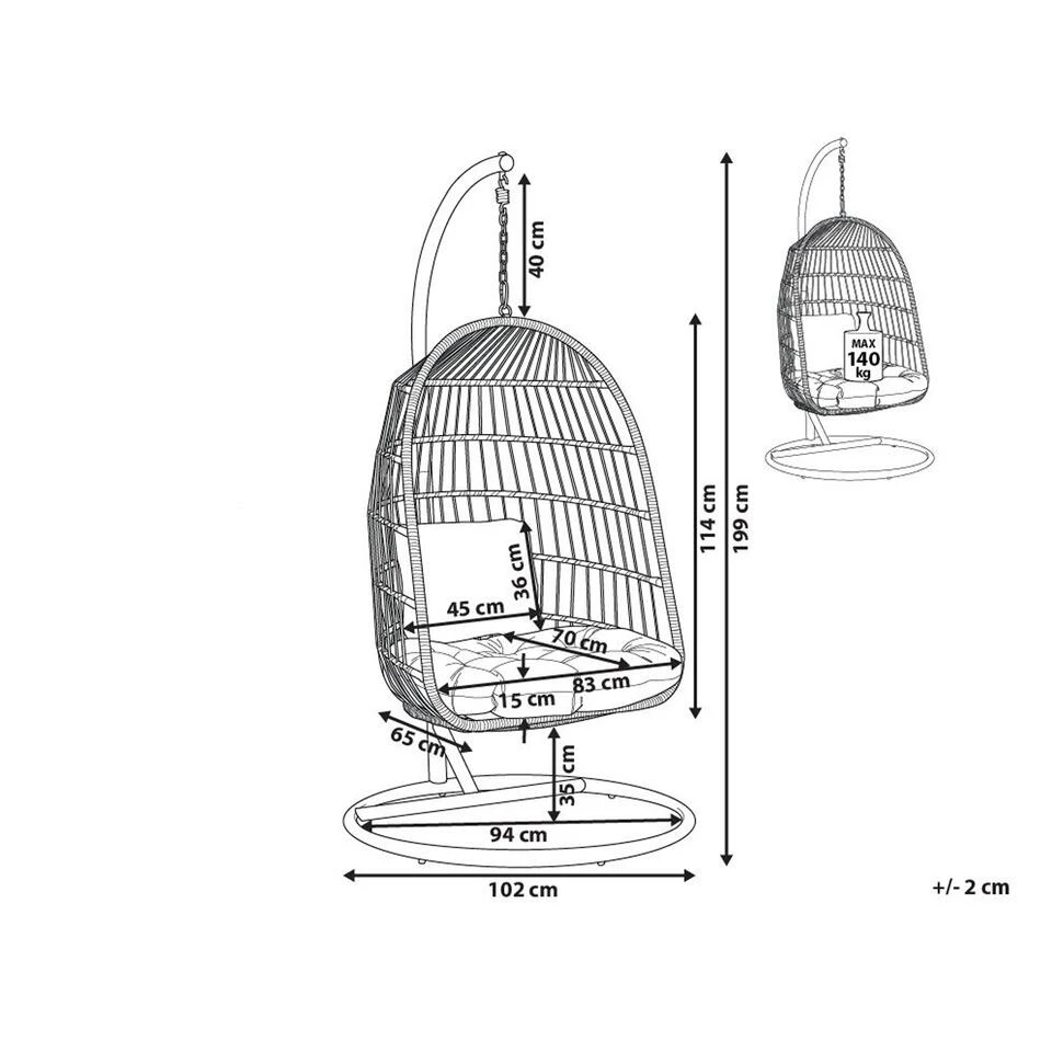 Ronde hangstoel met stalen standaard voor binnen en buiten, inclusief kussens. Het opvallende ontwerp van deze hangstoel van robuust polyrotan zorgt voor een romantisch en zorgeloos vakantiegevoel op de veranda of in de slaapkamer. De gevlochten stoel is opgehangen aan een zware metalen ketting, die op zijn beurt is bevestigd aan een zeer stabiel stalen frame. Zo biedt de stoel rustgevende, subtiele schommelingen en laat je zweven op het comfortabele, waterbestendige zitkussen, zoals op een wolk in de lucht.