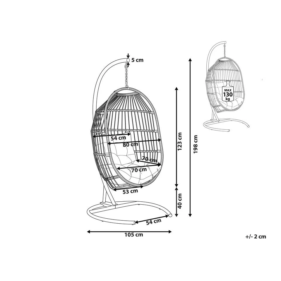 Wicker hangstoel met standaard en zacht donkergrijs kussen. Met zijn licht gebogen frame, zal deze prachtige hangstoel je absoluut comfort bieden. Het stevige metalen onderstel van de hangstoel garandeert maximale stabiliteit. De mand van PE rotan en het zachte zitkussen maken deze schommelstoel tot een comfortabele plek om te ontspannen. Het zitkussen is bovendien beschermd tegen Uv-straling, zodat je zowel binnen als buiten van deze stoel kunt genieten. Deze hangstoel staat bijzonder goed in Boho en modern ingerichte interieurs.