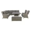 Modern loungeset van aluminium met lichtgrijze kussens. Dit elegante outdoor loungeset is gemaakt van robuust en weerbestendig aluminium in zwart, dat perfect wordt aangevuld met het grijs van de gestoffeerde kussens. De rechthoekige salontafel biedt niet alleen ruimte voor al je gasten maar hij is ook uitgerust met slimme techniek. Het tafelblad van veiligheidsglas kan aan drie zijden worden opgevouwen, zodat je je drankjes, snacks, mobiele telefoon of de computer gemakkelijk binnen handbereik hebt vanaf de bank. De hoekbankmodule bestaat uit verschillende delen die afzonderlijk of samen kunnen worden opgesteld.
