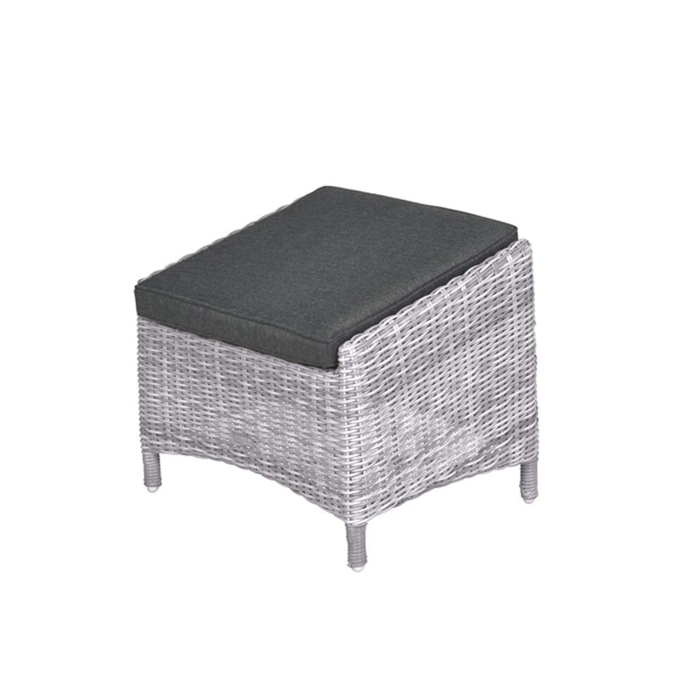 Ben je op zoek naar een voetenbank voor bij de Collin tuinstoel? De Collin voetenbank is een praktische voetenbank die veel wordt gecombineerd bij de Collin tuinstoel van kwaliteitsmerk Garden Impressions. De voetenbank wordt geleverd inclusief een comfortabel kussen. De voetenbank is voorzien van een aluminium binnen frame met daaromheen hand gevlochten 5 mm half rond kunststof wicker draad. Het kussen is gemaakt van hoogwaardige kwaliteit polyester. Het kussen is voorzien van een rits, waardoor de hoes gemakkelijk met de hand gewassen kan worden. Het kussen van de Collin voetenbank is niet waterbestendig en dient na gebruik opgeborgen te worden. Deze fijne voetenbank wordt volledig gemonteerd geleverd, het genieten kan direct beginnen. De afmeting van de voetenbank is : B 53 x D 53 x H 40,5 cm. Gemaakt van wicker in de kleur cloudy grey met een aluminium binnen frame en een polyester kussen in de kleur reflex black.