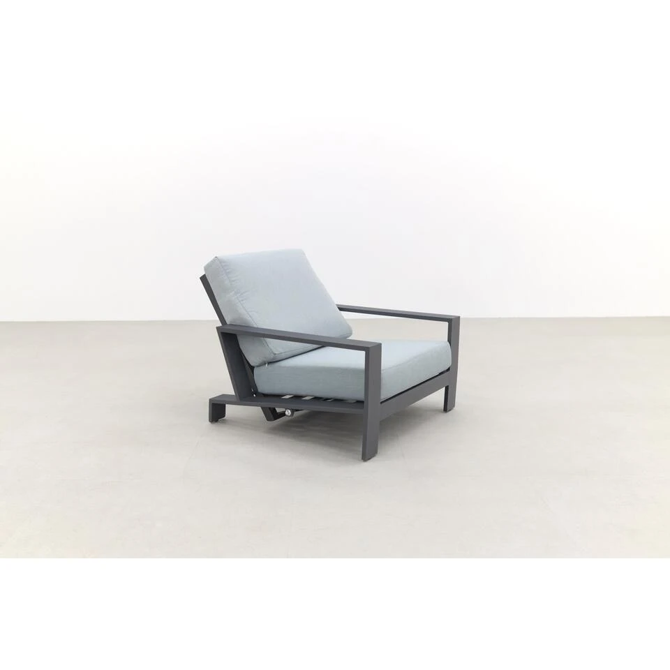 De Lincoln Loungeset met verstelbare loungestoel heeft een aluminium frame met een donkergrijze poedercoating. Deze coating zorgt ervoor dat het frame kras- en stootvast is. Aluminium heeft als voordeel dat het licht van gewicht is. Hierdoor is de verstelbare loungestoel eenvoudig te verplaatsen. De meegeleverde loungekussens voelen comfortabel aan en zijn gemaakt van hoogwaardig polyester. De hoezen van de kussens zijn afritsbaar en uitgevoerd in de kleur mint grey. Mochten de hoezen vies zijn geworden dan kun je deze met de hand uitwassen. De loungekussens zijn niet waterbestendig, daarom adviseren wij om ze na gebruik op een droge en geventileerde plek op te bergen. Wel zijn de kussens voorzien van een waterafstotende coating. Mocht er geknoeid worden met drinken dan veeg je het vocht er gemakkelijk weer vanaf, super handig toch!?