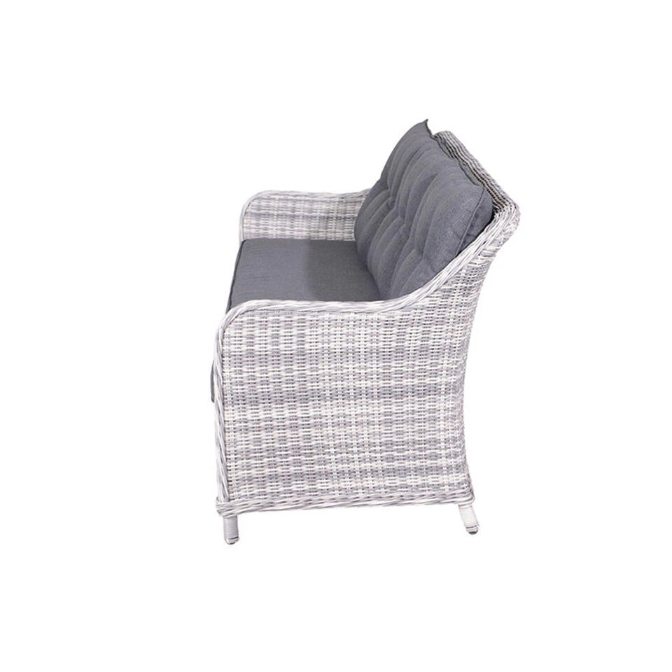 Deze driezits bank is vervaardigd uit onderhoudsvrij aluminium frame en weerbestendig half rond wicker kunststof vlechtwerkdraad in de kleur cloudy grey. Het draad heeft een dikte van maar liefst 5mm, wat zorgt voor een mooie robuuste uitstraling. Wicker is een stevig en duurzaam kunststof, waardoor je jarenlang kunt genieten van deze set.
