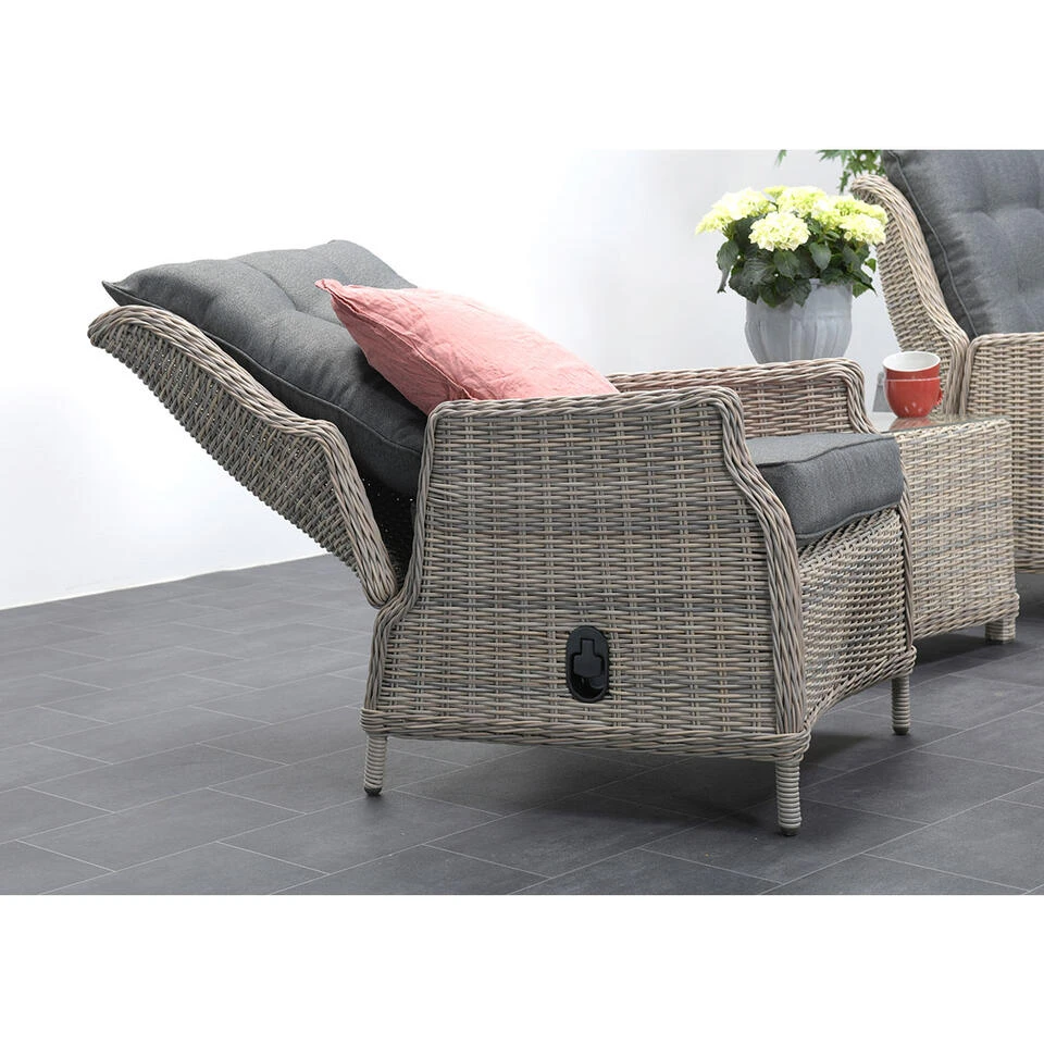 De rugleuning van deze stoel is door middel van een gasveer traploos in iedere gewenste stand te verstellen. Dit in combinatie met de polyester dikke, comfortabele kussens zorgt voor veel plezier.
