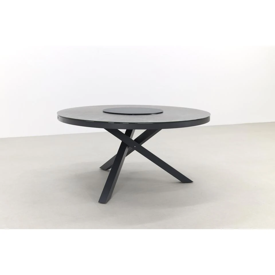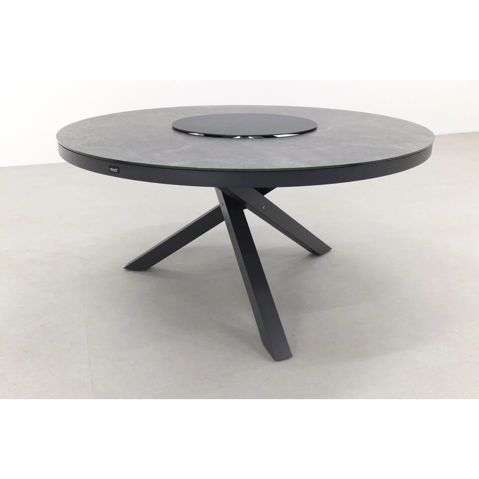 De poten van de Ronde tuintafel Perth hebben een kruisvorm en zijn gemaakt van aluminium. Dit materiaal is licht van gewicht, stevig en het materiaal kan niet gaan roesten. Dit maakt dat het het perfecte materiaal is voor de ronde tuintafel. Het tafelblad is van keramiek. Dit is een harde steensoort die gespoten is op een plaat van veiligheidsglas. Het keramiek is krasvast, hitte bestendig en uv bestendig. Kortom ideaal om te gebruiken als tafelblad. De lazy susan, ook wel draaiplateau genoemd, wordt standaard bij de tafel geleverd. Dit plateau is draaibaar en dus ideaal als je met meerdere mensen aan de ronde tuintafel eet. Het doorgeven wordt met het draaiplateau een feestje.